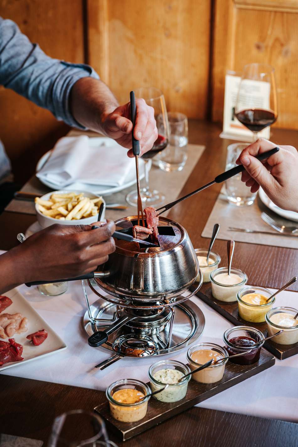Das Fleisch für unser Fondue Chinoise wird von Hand geschnitten, mit einer herzhaften Bouillon serviert und durch die hausgemachten Saucen köstlich abgerundet. Auch Vegetarier dürfen sich auf ein ansprechendes und vielseitiges Angebot freuen.